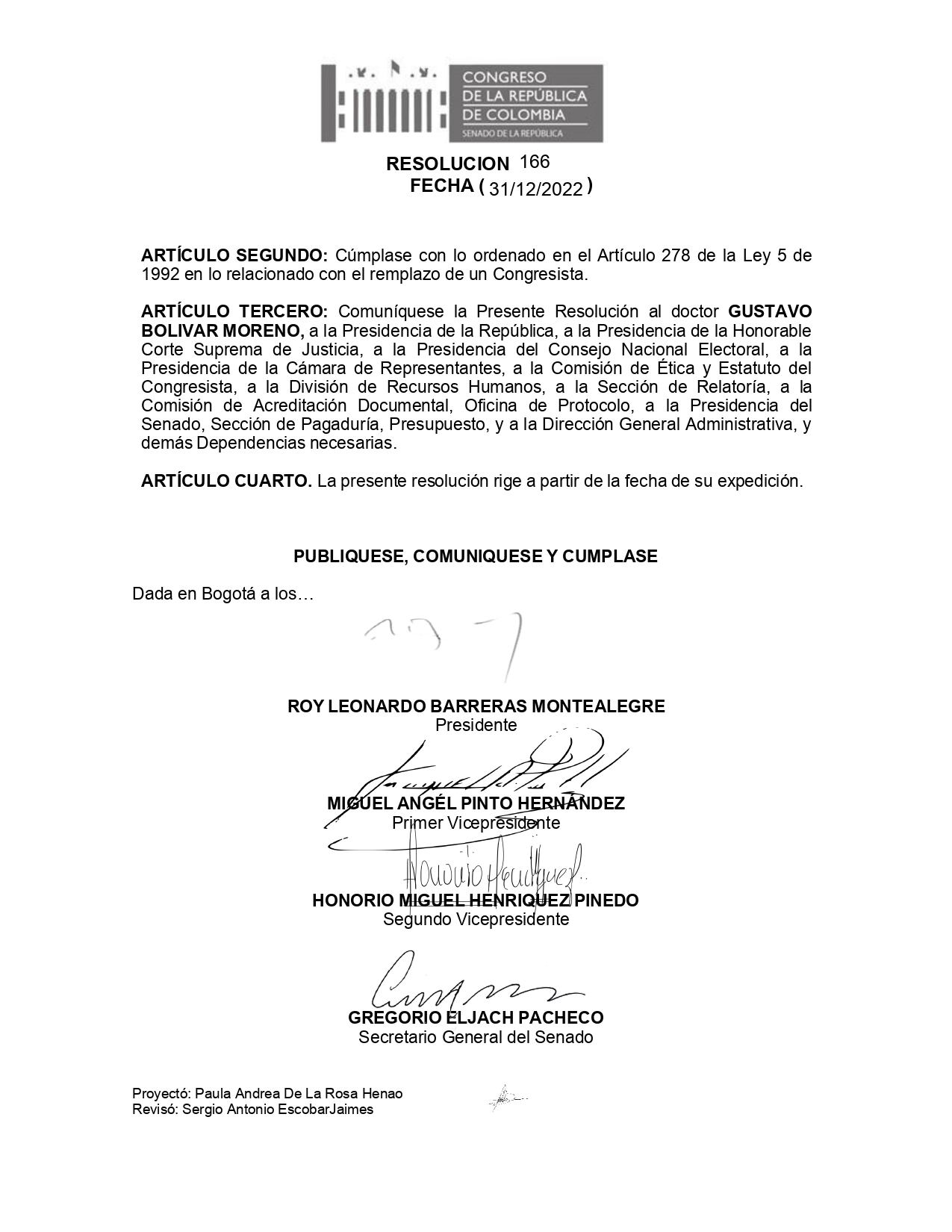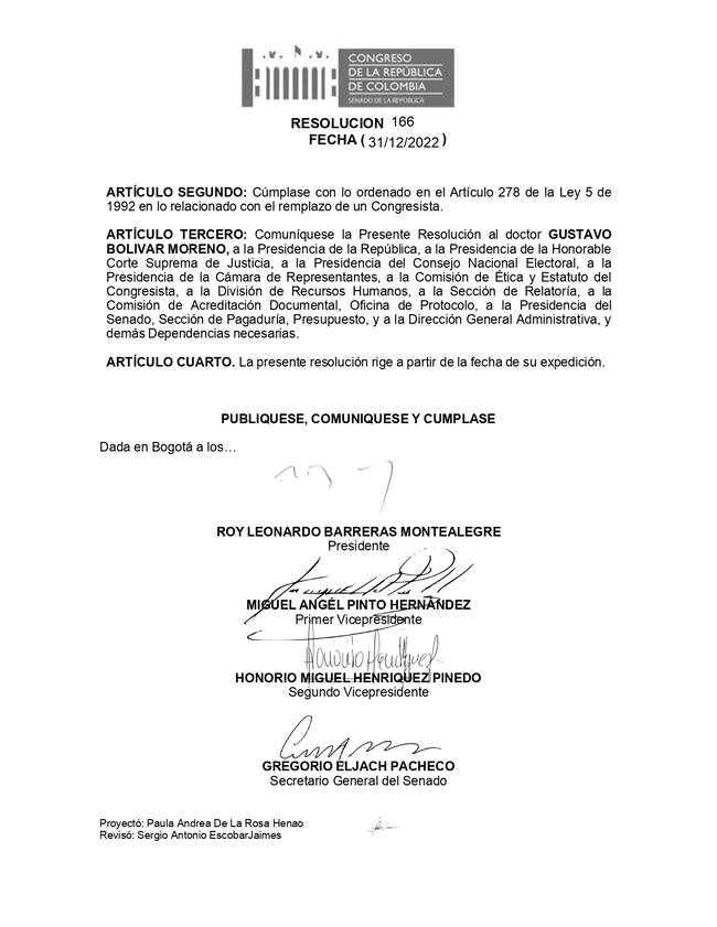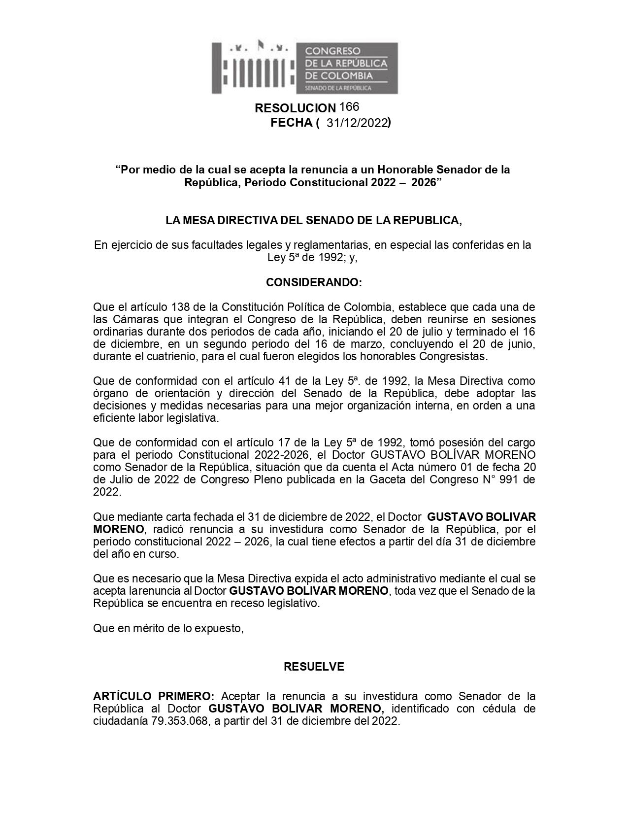 “Que mediante carta fechada el 31 de diciembre de 2022, el doctor Gustavo Bolívar Moreno radicó renuncia a su investidura como Senador de la República, por el periodo constitucional 2022 – 2026, la cual tiene efectos a partir del día 31 de diciembre del año en curso”, dice la resolución firmada por el presidente del Senado, los vicepresidentes y el secretario general.