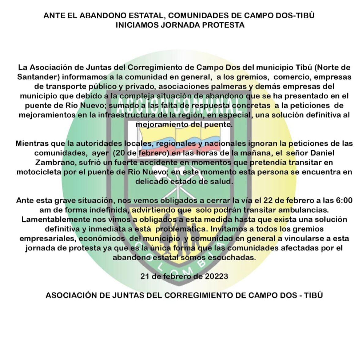 Comunicado de la Asociación de Juntas del corregimiento de Campo Dos