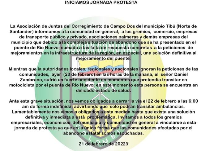 La Asociación de Juntas del Corregimiento de Campo Dos a través de un comunicado, anunció una jornada de protesta para este miércoles 22 de febrero desde las 6:00 de la mañana y de manera indefinida, advirtiendo que sólo podrán transitar ambulancias.