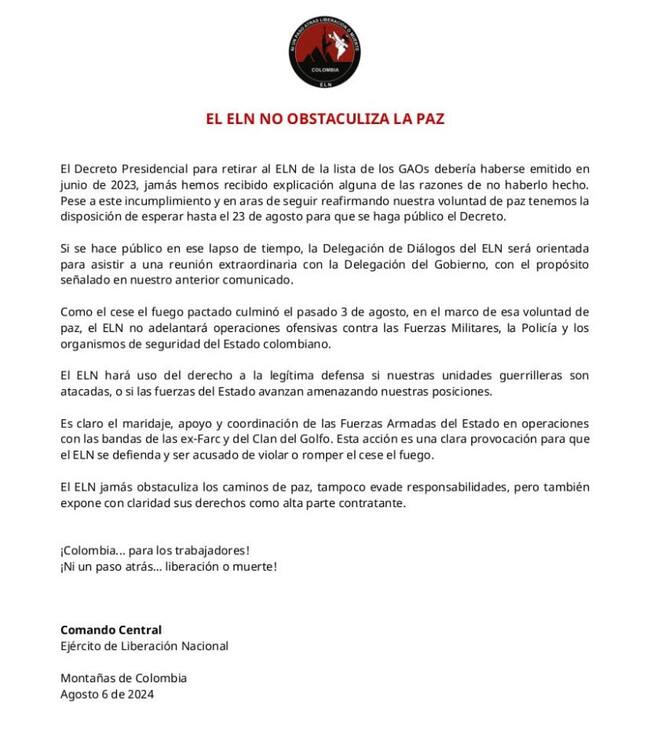 Luego de que se venciera el cese al fuego entre el Gobierno Nacional y el ELN profundizándose la crisis del proceso, por medio de un comunicado esa guerrilla le dio un último plazo al Gobierno para que genere el decreto que los retire del listado de grupos criminales y les reconozca el estatus político: ese plazo es el 23 de agosto (según el Eln, el decreto debía haberse emitido en junio de 2023).