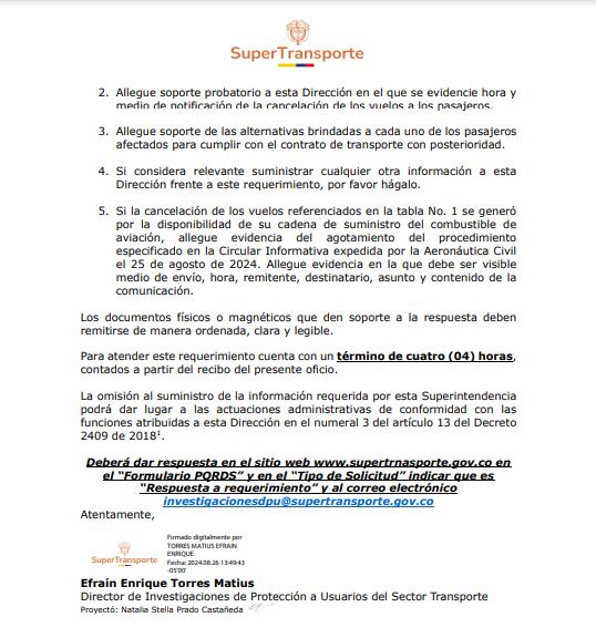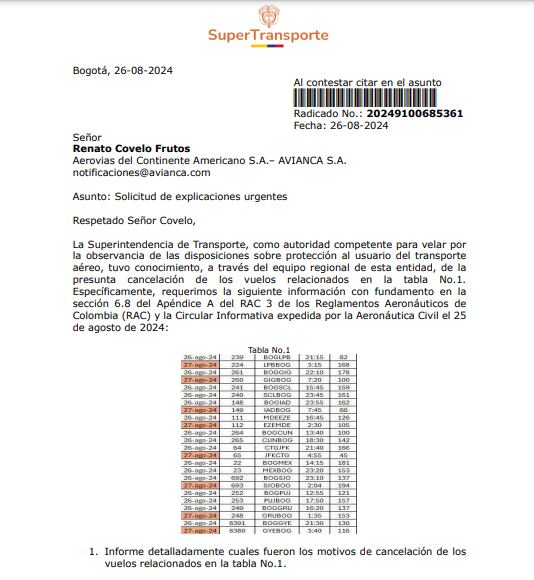 En el documento, que deberá tener respuesta este mismo lunes, se pide a Avianca que exponga y sustente los motivos que le llevaron a declarar las respectivas cancelaciones, incluyendo si se trató por restricciones en el suministro de combustible para aviones.