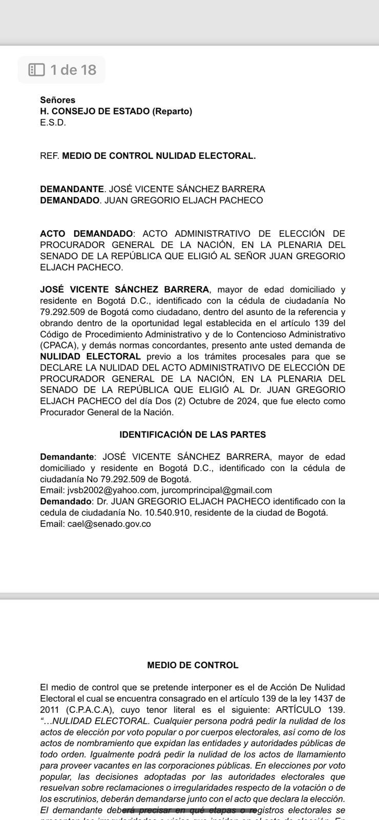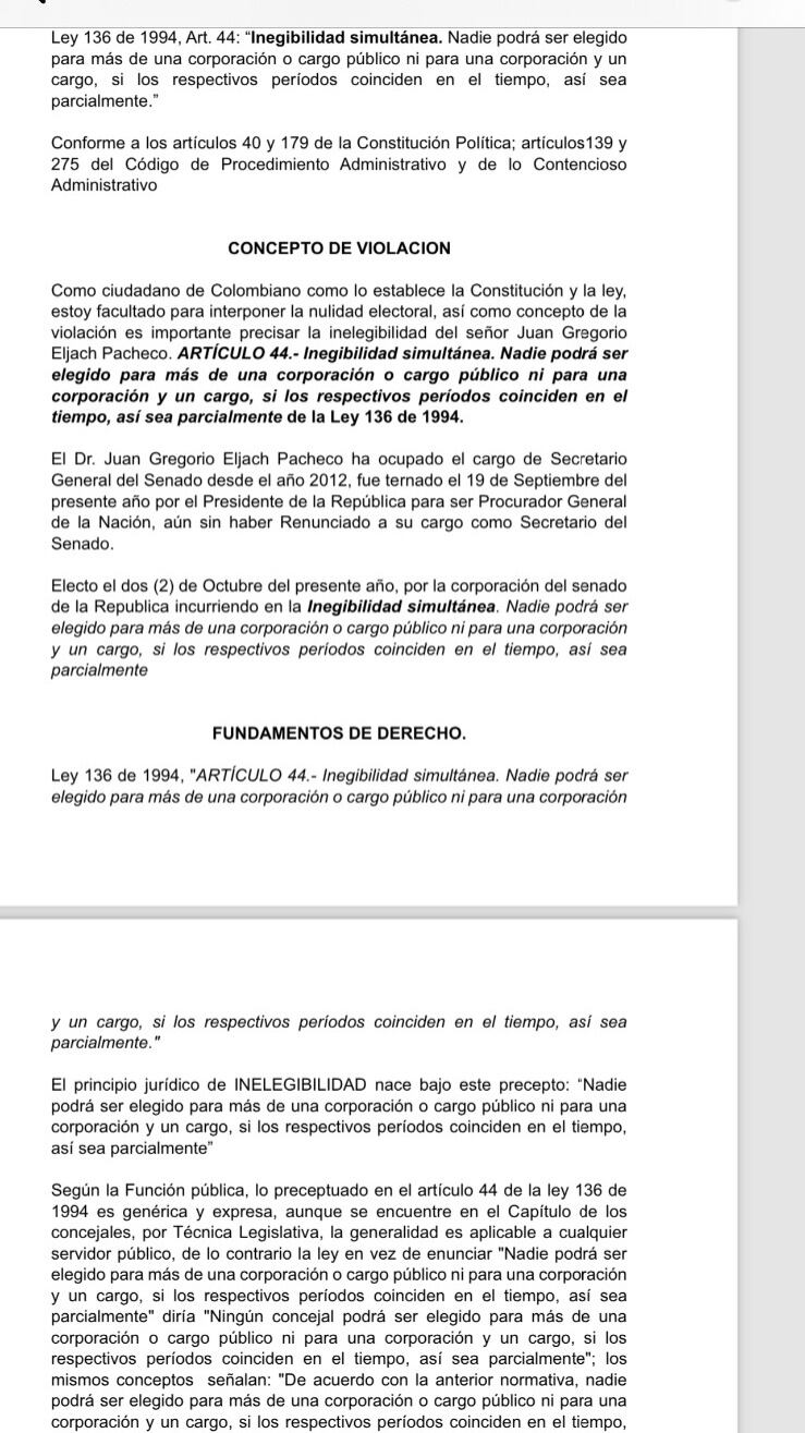 “Gregorio Eljach Pacheco ha ocupado el cargo de secretario general del Senado desde el año 2012, fue ternado el 19 de Septiembre del presente año por el presidente de la República para ser procurador general de la Nación, aún sin haber renunciado a su cargo como secretario del Senado”, expone puntualmente la demanda.