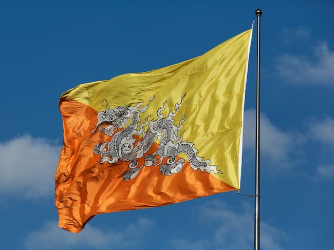 La bandera de Bután exhibe un dragón blanco llamado Druk, que en el idioma local significa “dragón del trueno”. El dragón sostiene gemas en sus garras, simbolizando la riqueza y la perfección. El fondo se divide en dos colores diagonales: amarillo, representando la autoridad secular de la monarquía, y naranja, que refleja la tradición espiritual del budismo. Esta combinación destaca la armonía entre el poder temporal y espiritual en el país.