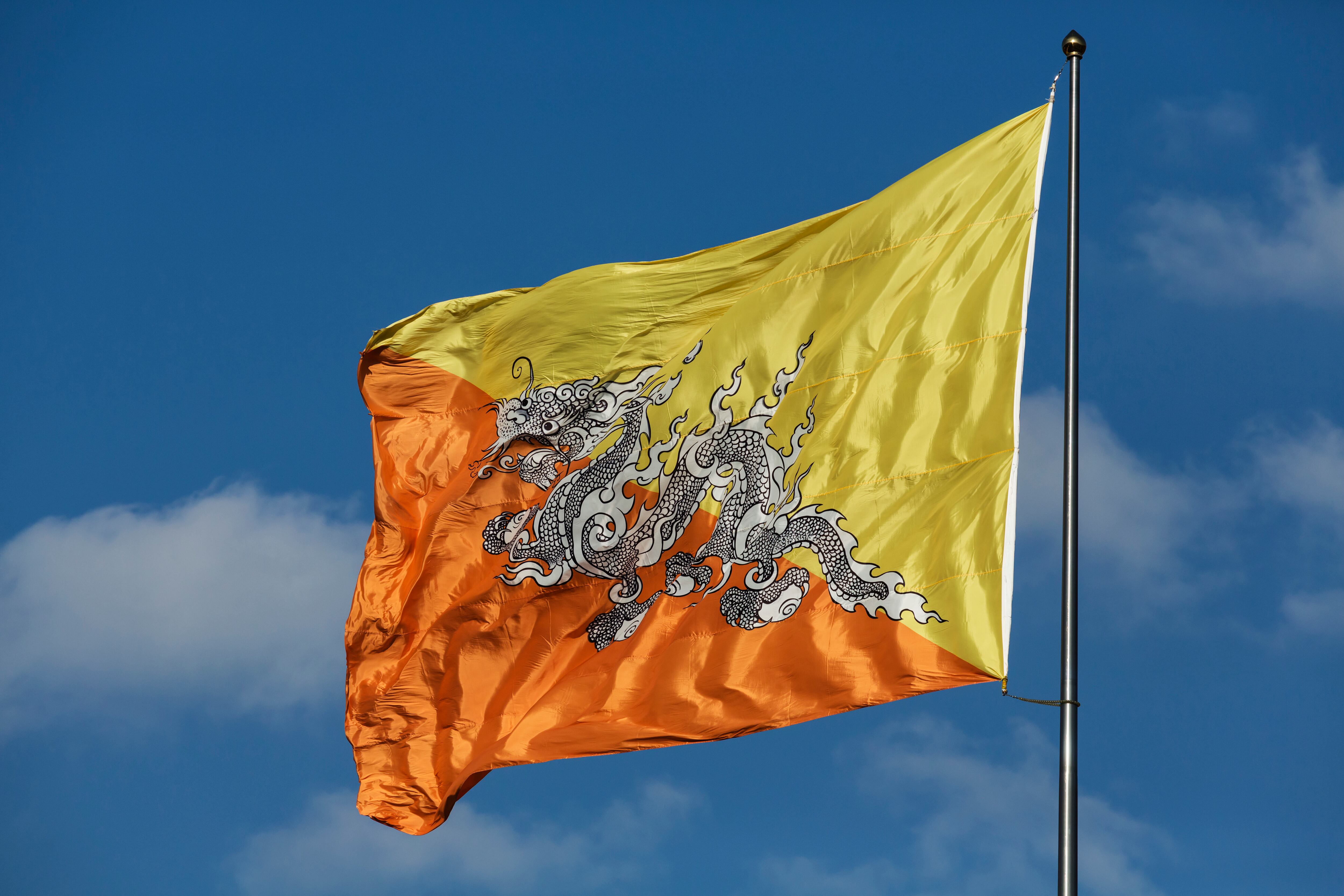 La bandera de Bután exhibe un dragón blanco llamado Druk, que en el idioma local significa “dragón del trueno”. El dragón sostiene gemas en sus garras, simbolizando la riqueza y la perfección. El fondo se divide en dos colores diagonales: amarillo, representando la autoridad secular de la monarquía, y naranja, que refleja la tradición espiritual del budismo. Esta combinación destaca la armonía entre el poder temporal y espiritual en el país.