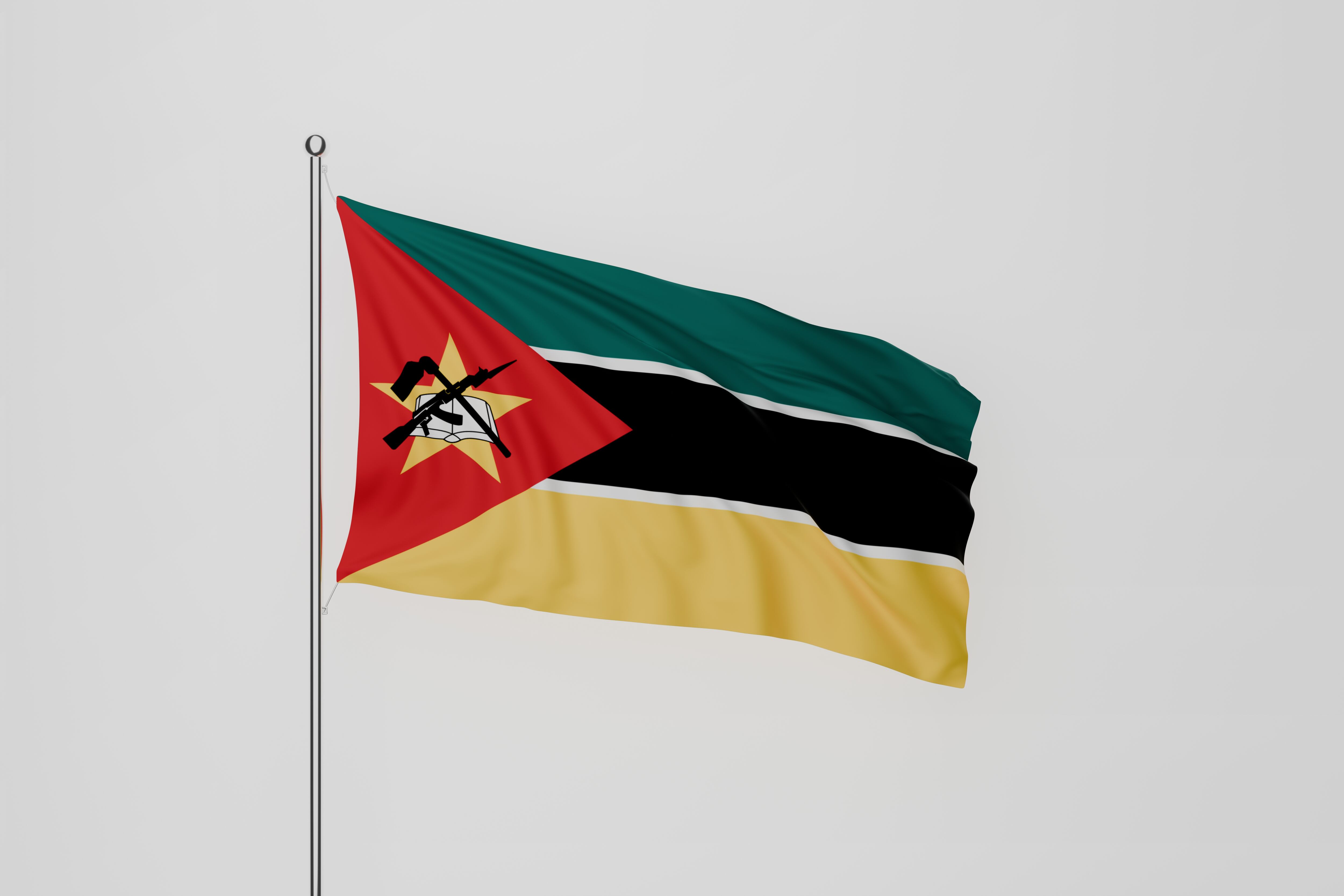 La bandera de Mozambique es la única en el mundo que presenta un fusil moderno, un AK-47 con bayoneta calada, superpuesto sobre un libro abierto. Estos elementos simbolizan la defensa y la educación, respectivamente. Además, una azada representa la agricultura. El fondo se compone de franjas horizontales de verde, negro y amarillo, separadas por delgadas líneas blancas, y un triángulo rojo en el lado izquierdo que simboliza la lucha por la independencia. Este diseño refleja la historia del país y su compromiso con el desarrollo y la paz.