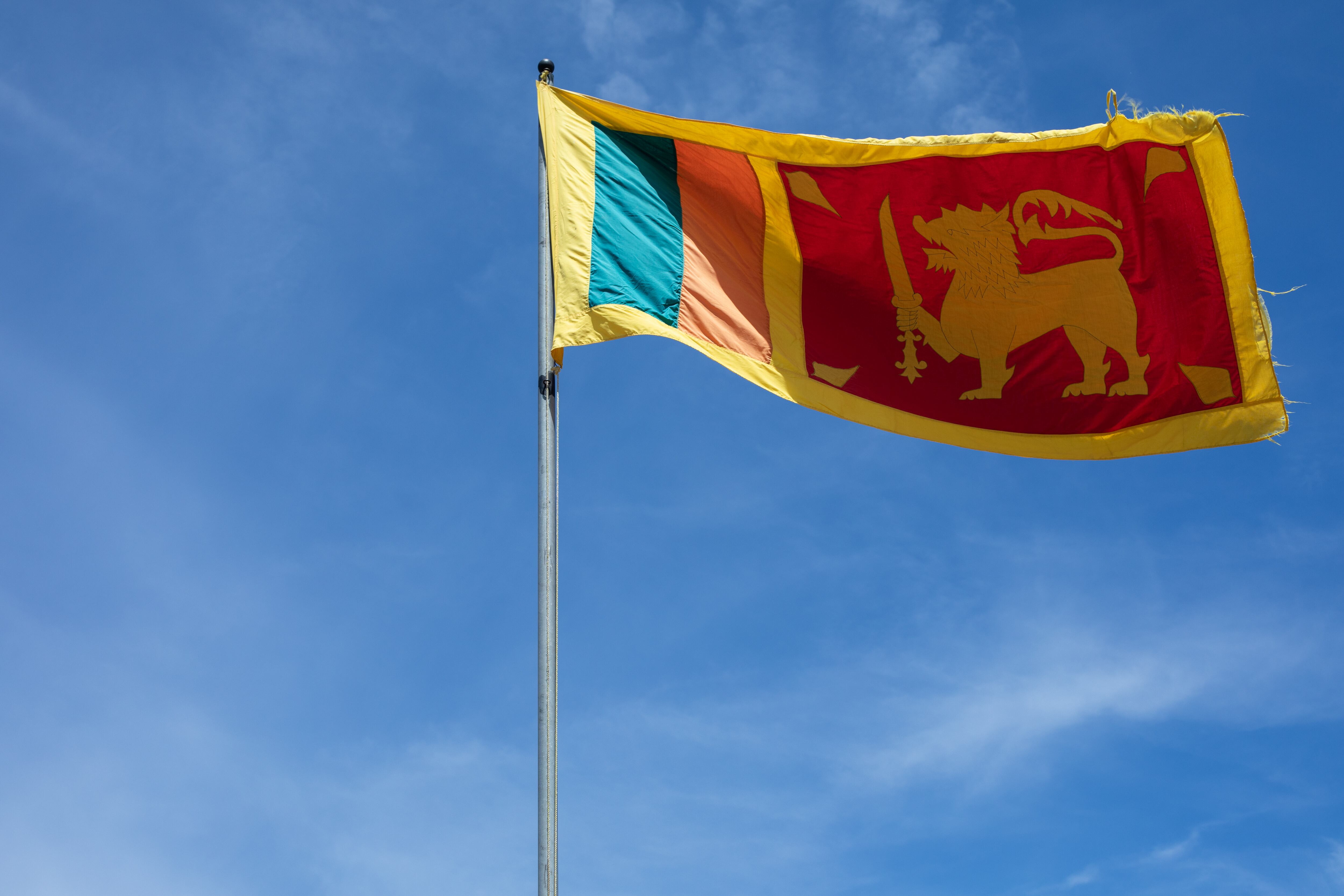 La bandera de Sri Lanka, conocida como la “Bandera del León”, presenta un león dorado sosteniendo una espada en un fondo carmesí, que simboliza la valentía de la nación. A la izquierda, dos franjas verticales en verde y naranja representan a las minorías musulmana y tamil, respectivamente, reflejando la diversidad étnica del país. Las cuatro hojas de bo en las esquinas del panel carmesí representan las virtudes del budismo: benevolencia, compasión, alegría y ecuanimidad.