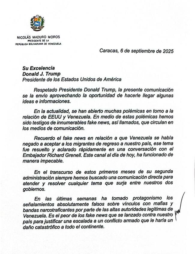 Maduro asegura que son “absolutamente falsos” los señalamientos sobre “vínculos con mafias y bandas narcotraficantes”. “Es el peor de los fake news que se ha lanzado contra nuestro país para justificar una escalada a un conflicto armado que le haría un daño catastrófico a todo el continente”, añade el texto en el que invita a Trump a “preservar la paz con diálogo y entendimiento en todo el hemisferio”.