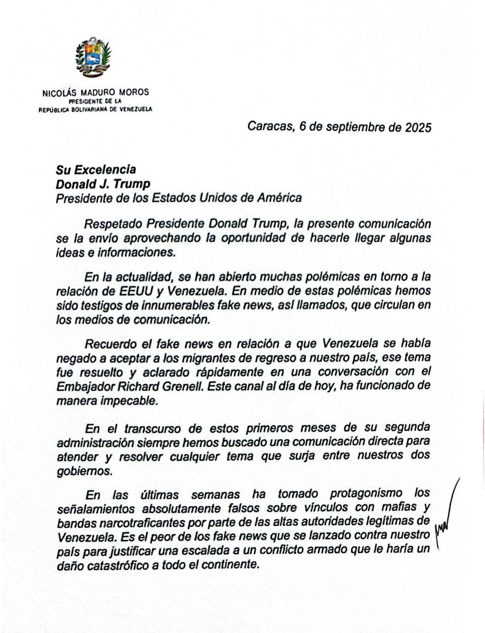 Maduro asegura que son “absolutamente falsos” los señalamientos sobre “vínculos con mafias y bandas narcotraficantes”. “Es el peor de los fake news que se ha lanzado contra nuestro país para justificar una escalada a un conflicto armado que le haría un daño catastrófico a todo el continente”, añade el texto en el que invita a Trump a “preservar la paz con diálogo y entendimiento en todo el hemisferio”.