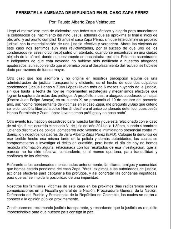 “Otro caso que nos asombra y no origina en nosotros percepción alguna de una administración de justicia transparente y eficiente, es el hecho de que dos culpables condenados (Jesús Henao y Zuan López) lleven más de 6 meses huyendo de la justicia, sin que hasta la fecha de hoy se implementen estrategias y mecanismos efectivos que logren la captura de estos dos prófugos. A propósito, nuestro abogado apoderado principal (doctor Juan Felipe Amaya) en su cuenta X, se pronunció el 10 de octubre del presente año, así: -como representante de víctimas en el caso Zapa, me pregunto ¿Bajo qué criterio se le concedió la libertad a Joice Hernández? Era el único condenado detenido, pues Jesús Henao Sarmiento y Zuan López llevan tiempo prófugos y no pasa nada-”, agregó.